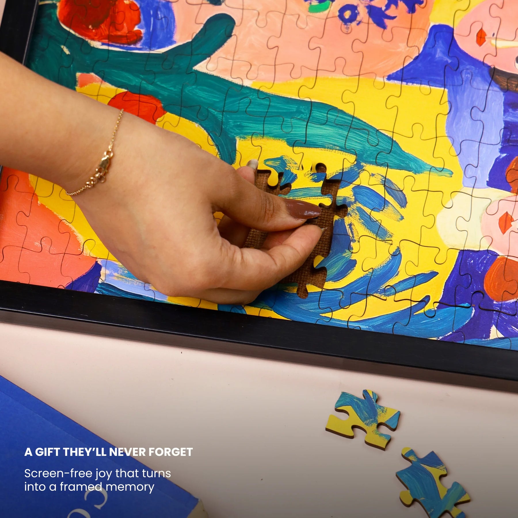 Designed by Sharvari Kolte from Mumbai, whose illustrations capture intimacy and everyday tenderness. India’s first puzzle that becomes framed art, no glue, no tools. Perfect for gifting to a friend who feels like family, or framing as a daily reminder of closeness.