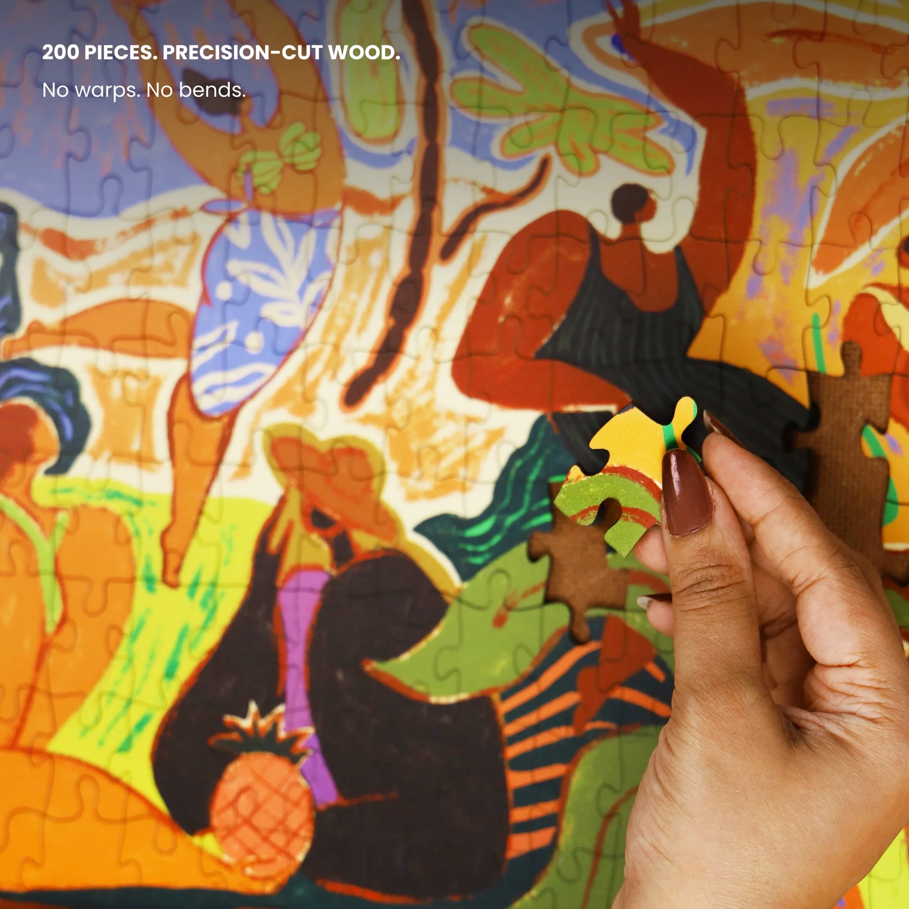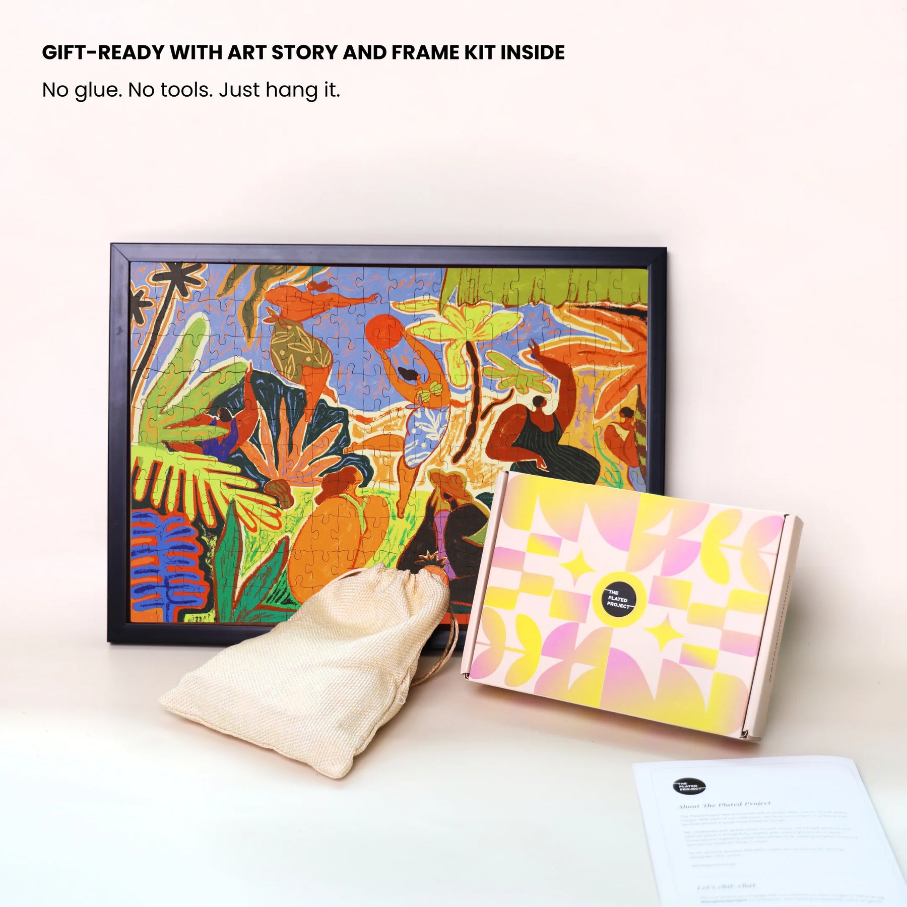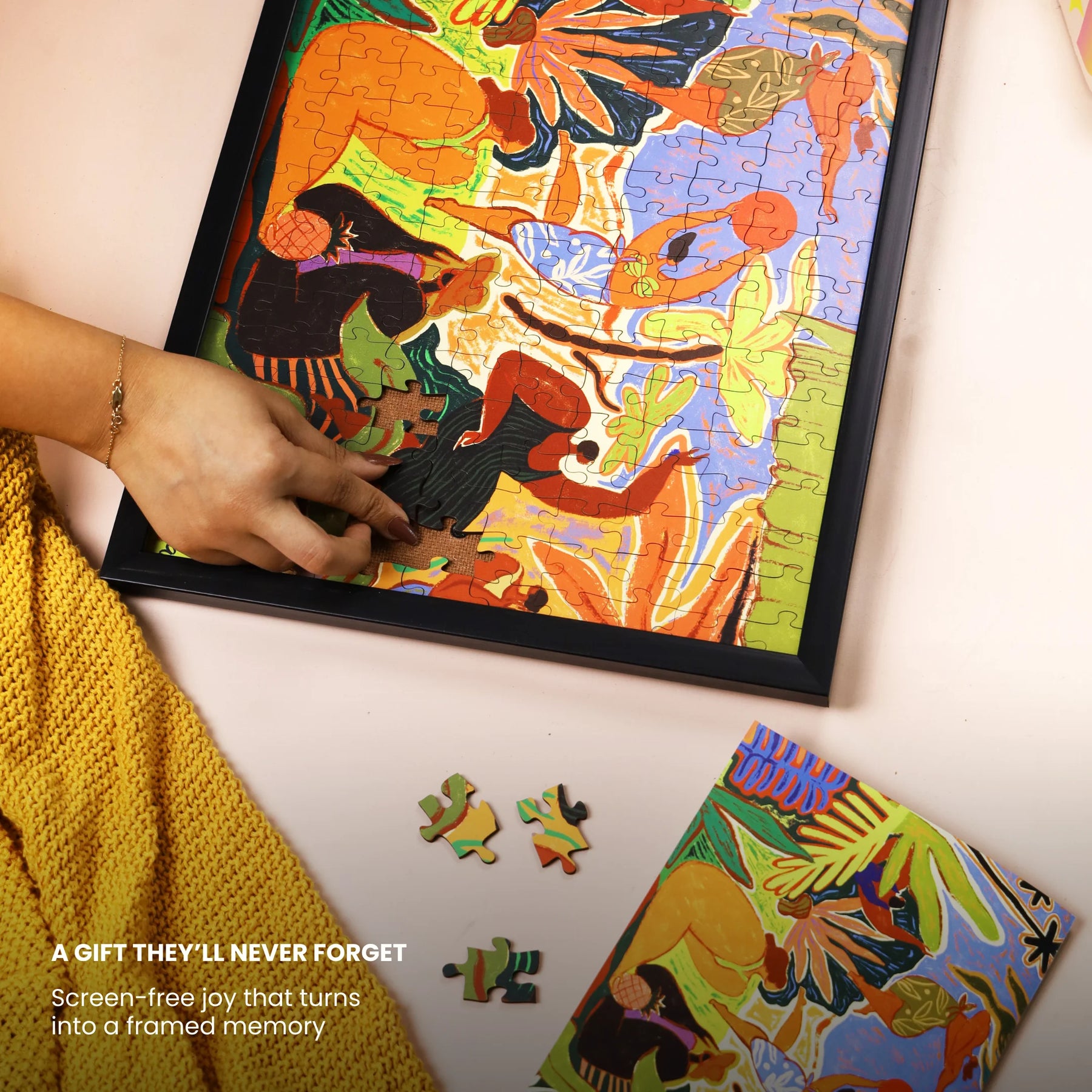 Designed by Arty Guava, a Vancouver-based illustrator whose bold, playful style finds rhythm in life’s quiet and loud moments. India’s first puzzle that becomes framed art, no glue, no tools, ready to frame as lasting art or gift as memory.