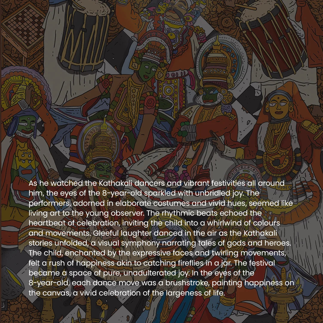 As he watched the Kathakali dancers and vibrant festivities all around him, the eyes of the 8-year-old sparkled with unbridled joy. The performers, adorned in elaborate costumes and vivid hues, seemed like living art to the young observer. The rhythmic beats echoed the heartbeat of celebration, inviting the child into a whirlwind of colours and movements. Gleeful laughter danced in the air as the Kathakali stories unfolded, a visual symphony narrating tales of gods and heroes. The child, enchanted by the expressive faces and twirling movements, felt a rush of happiness akin to catching fireflies in a jar. The festival became a space of pure, unadulterated joy. In the eyes of the 8-year-old, each dance move was a brushstroke, painting happiness on the canvas, a vivid celebration of the largeness of life.
