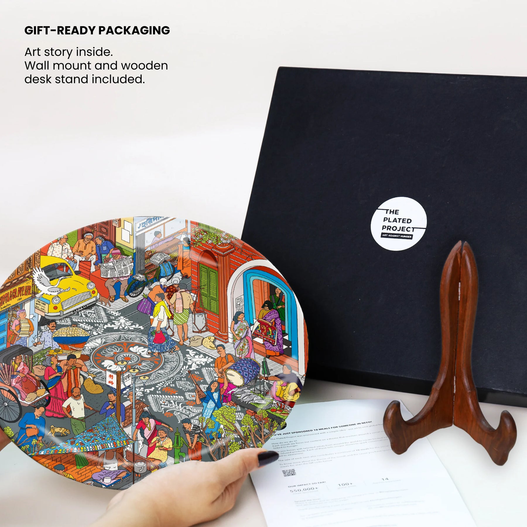 From The Plated Project × Antiquity Discoveries collection, this limited-edition decor plate captures Kolkata’s layered poetry, the Heron’s gaze pausing on tram bells, tea shop whispers, and the quiet grace of Jamdani-clad women.