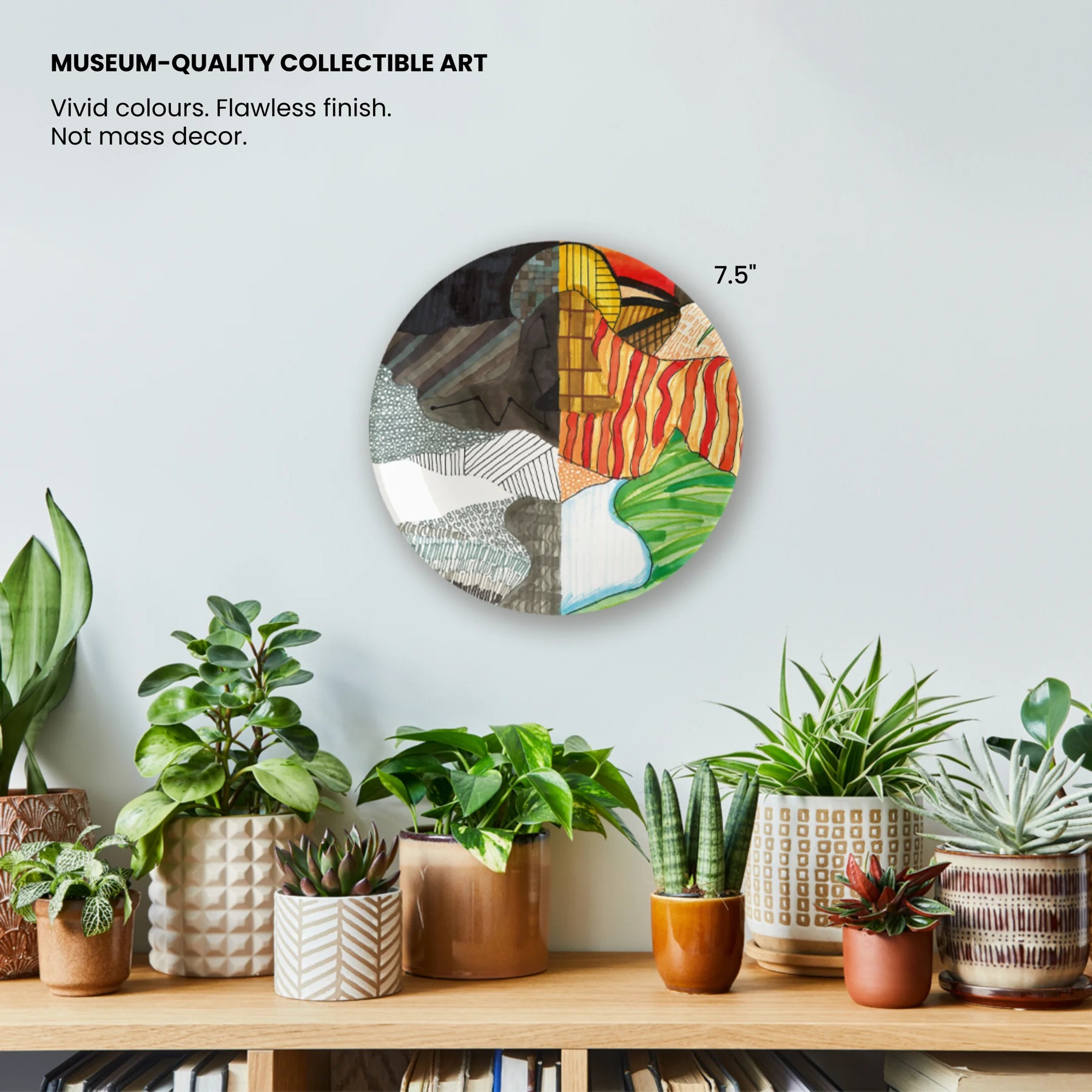 All our decor plates are carefully designed by global artists & each piece comes with a thoughtfully crafted story card that surrounds a social issue. With every plate you buy you will also sponsor at least 10 meals for those in need, fighting the global hunger crisis with art. Indulge in the allure of high-quality ceramic plates digitally printed in high resolution that effortlessly enhances any space. With an easy-to-maintain dust and water repellent coating, preserving their impeccable appearance is a breeze.