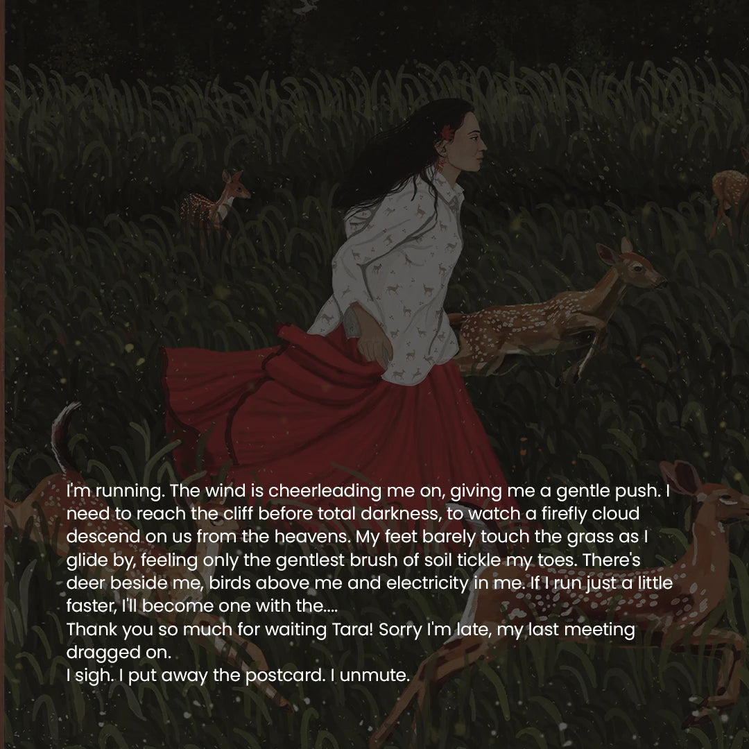 I'm running. The wind is cheerleading me on, giving me a gentle push. I need to reach the cliff before total darkness, to watch a firefly cloud descend on us from the heavens. My feet barely touch the grass as I glide by, feeling only the gentlest brush of soil tickle my toes. There's deer beside me, birds above me and electricity in me. If I run just a little faster, I'll become one with the....