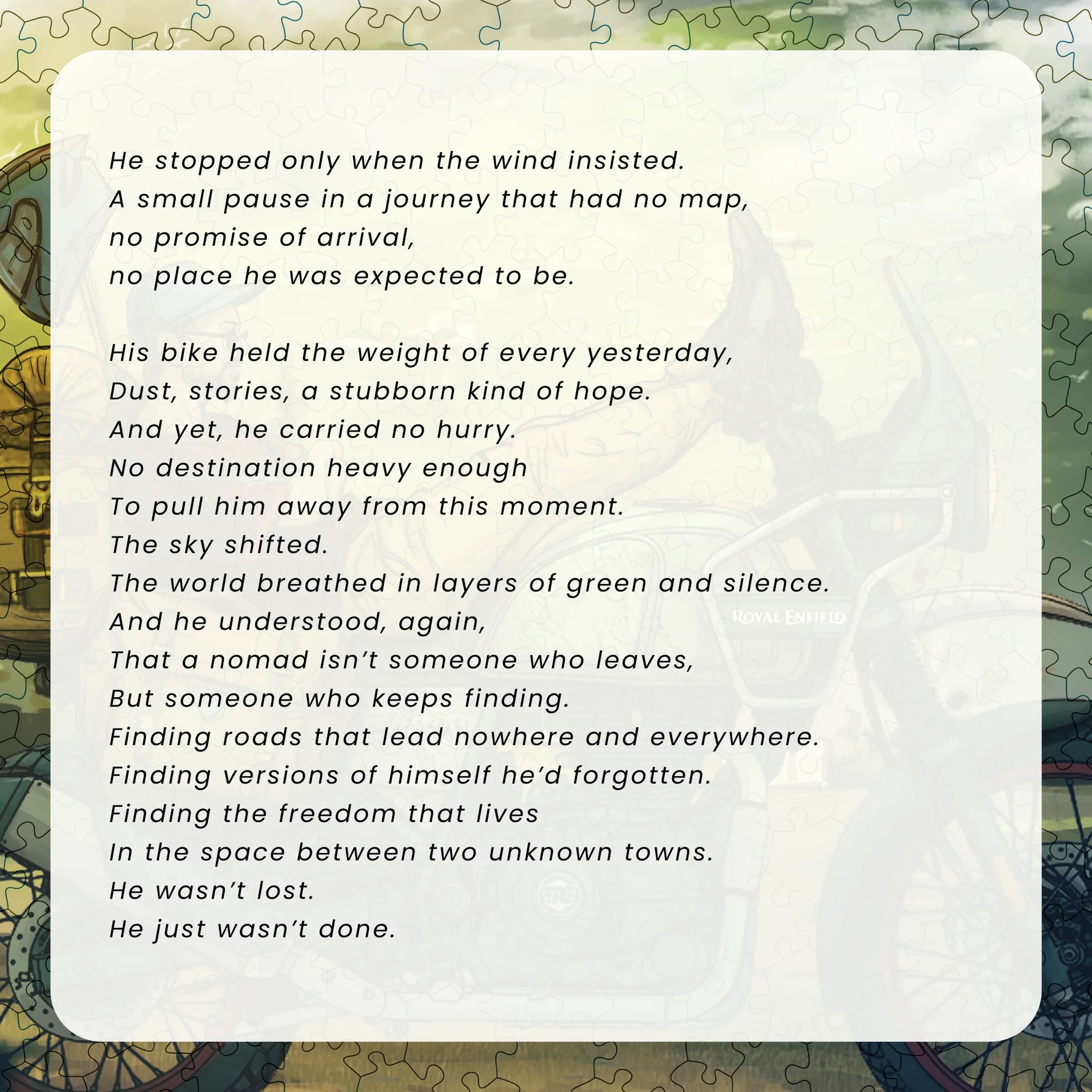Designed by Shubham Sarkar, whose visual worlds honour freedom, open skies, and stories found between two unknown towns. India’s first puzzle that becomes framed art, no glue, no tools. A keepsake for riders, dreamers, explorers, and the ones who feel most themselves on a long road.