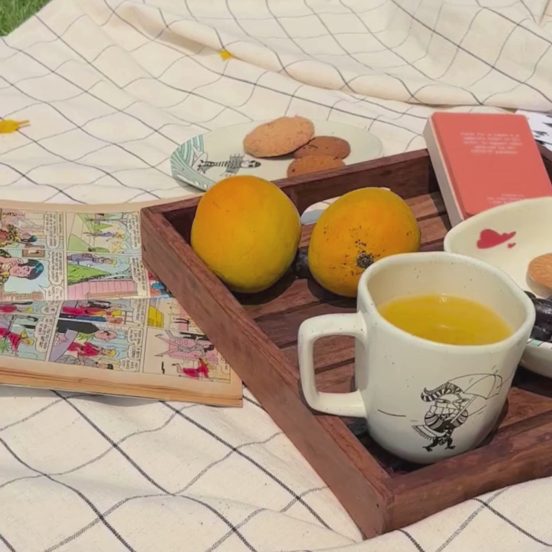 Part of our Gond-inspired tea-time collection, In the Rain captures the earthy magic of a downpour — dotted with hand-drawn motifs, rooted in tradition, and wrapped in quiet wonder.