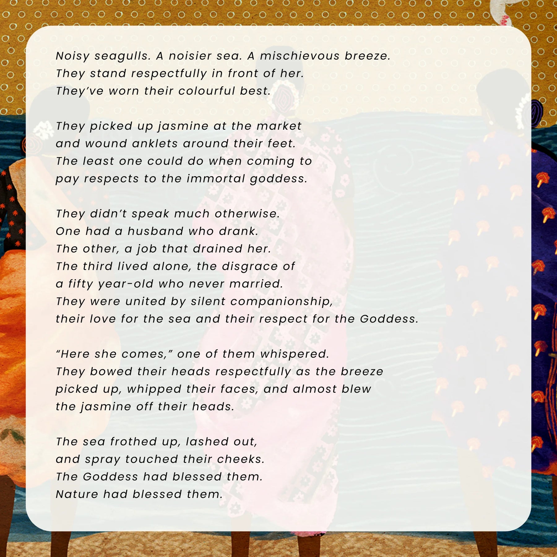 “Here she comes” one of them whispered. They bowed their heads respectfully as the breeze picked up, whipped their faces and almost blew the jasmine of their heads. The sea frothed up, lashed out, and spray touched their cheeks.