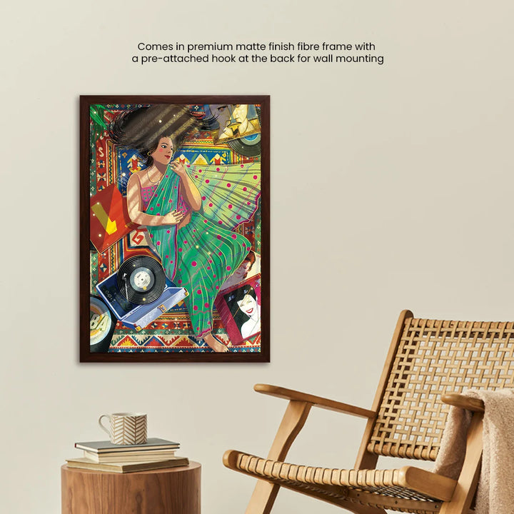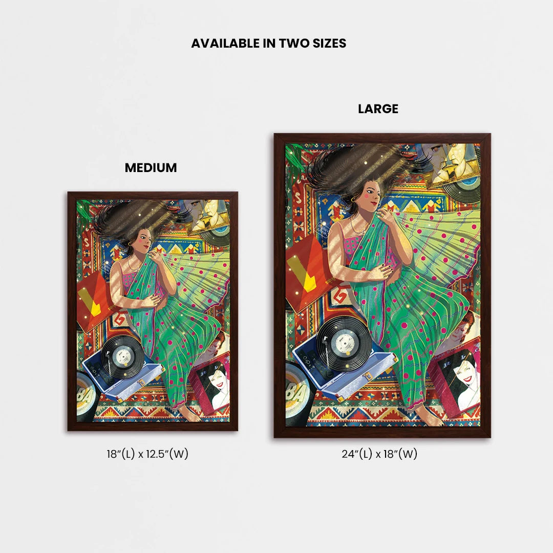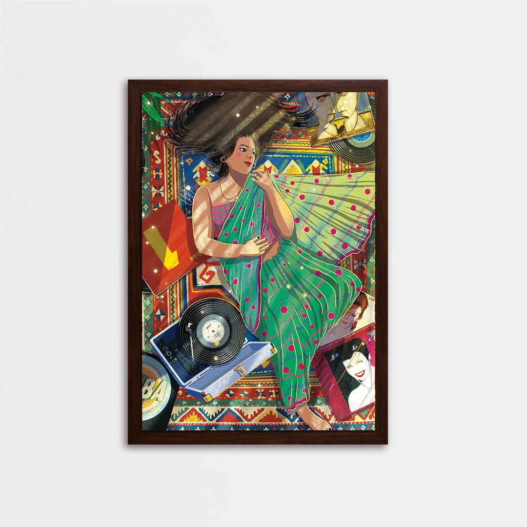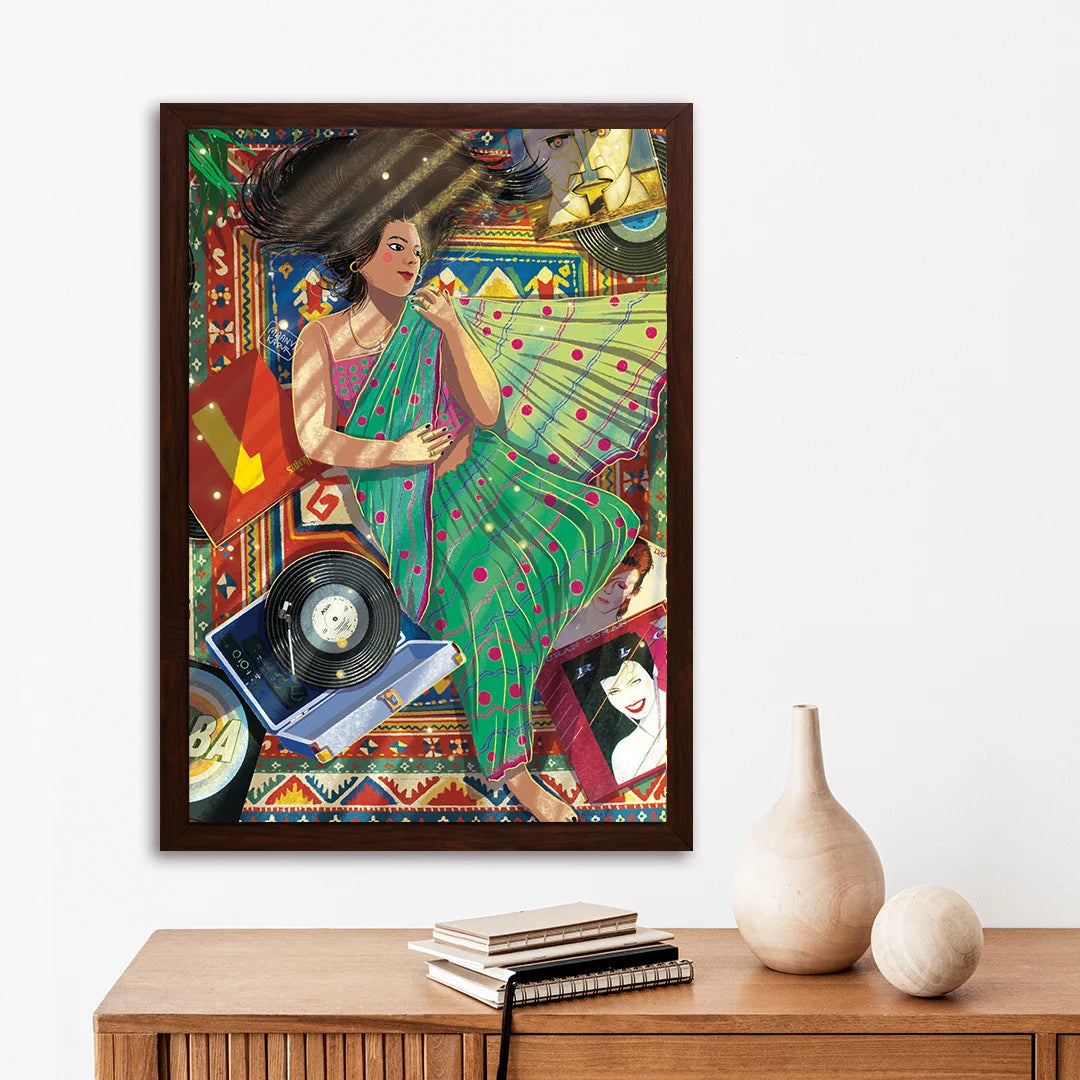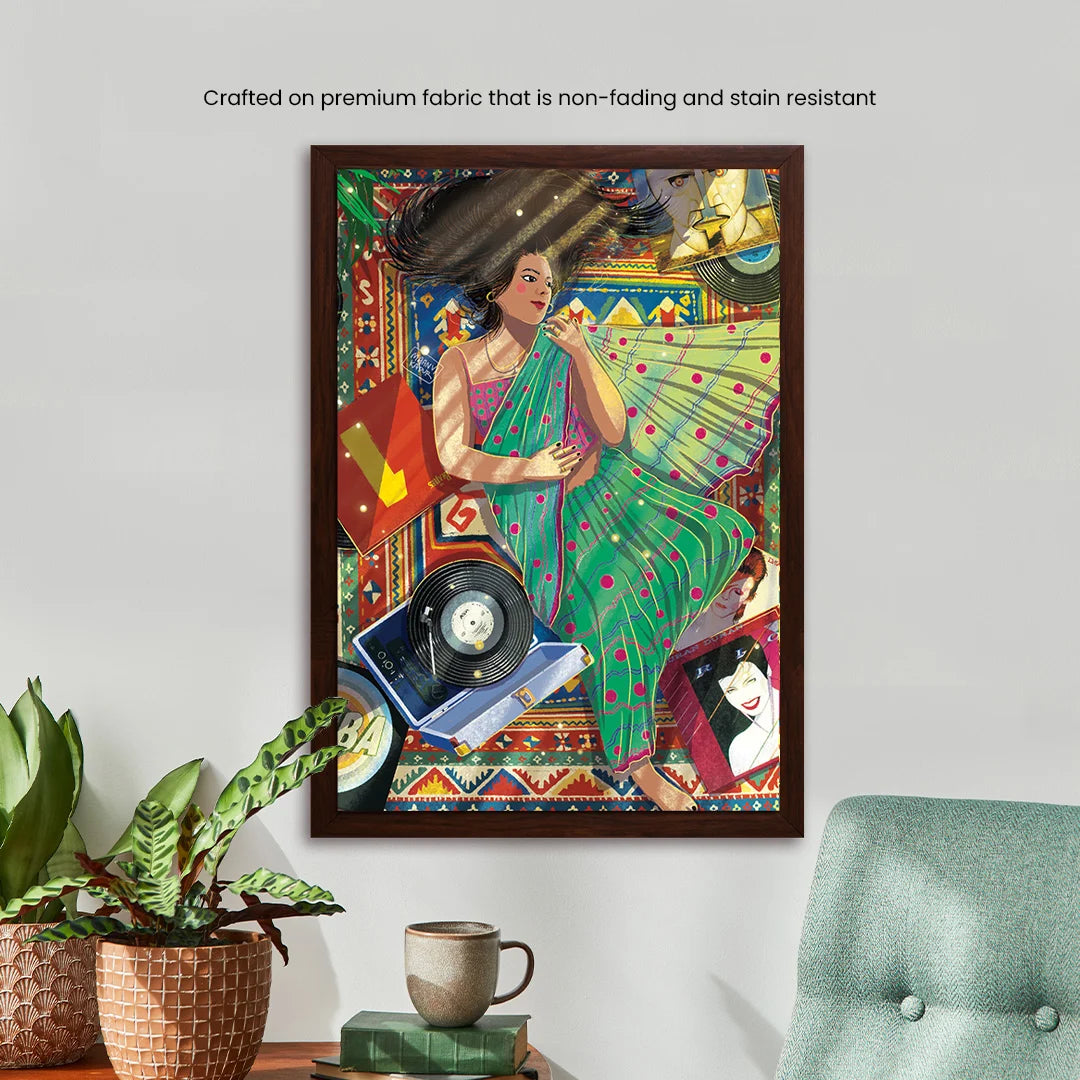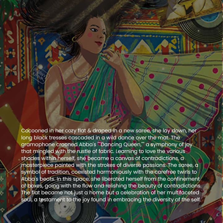 Cocooned in her cozy flat & draped in a new saree, she lay down, her long black tresses cascaded in a wild dance over the mat. The gramophone crooned Abba's ""Dancing Queen,"" a symphony of joy that mingled with the rustle of fabric. Learning to love the various shades within herself, she became a canvas of contradictions, a masterpiece painted with the strokes of diverse passions. The saree, a symbol of tradition, coexisted harmoniously with the carefree twirls to Abba's beats. In this space, she liberated herself from the confinement of boxes, going with the flow and relishing the beauty of contradictions. The flat became not just a home but a celebration of her multifaceted soul, a testament to the joy found in embracing the diversity of the self.