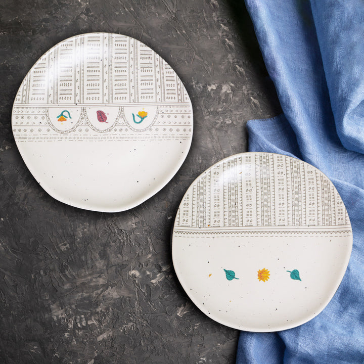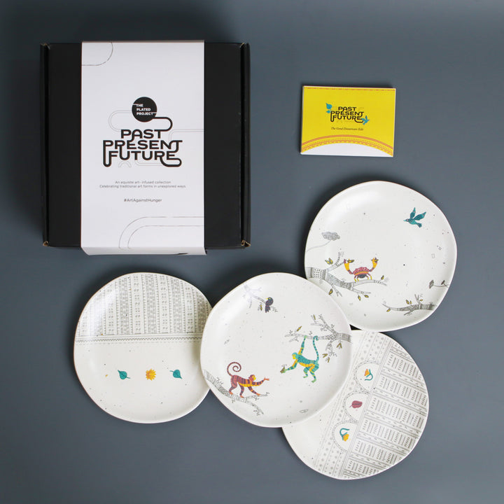 The organic-shaped, hand-crafted quarter plates each celebrate a tree that is intimately connected to Gond Culture.The different plates depict the saja tree, peepal tree, tamarind tree and pakri tree representing the deities and creators in the culture.