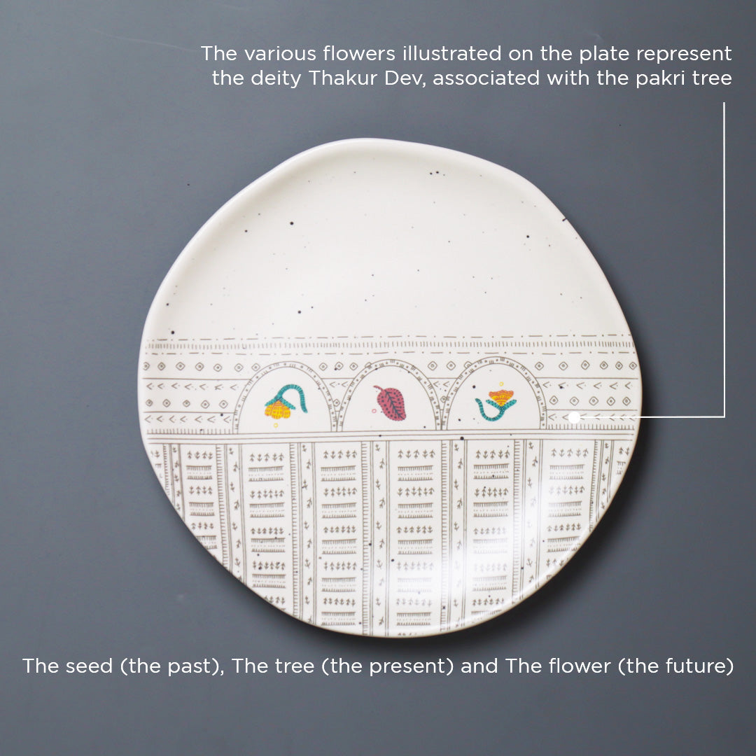 Pakri tree: The various flowers illustrated on the plate represent the deity Thakur Dev in Gond culture, who is associated with the Pakri tree. It is also believed that Pakri leaves are cooked to make saag, a dish which protects people from illnesses.
