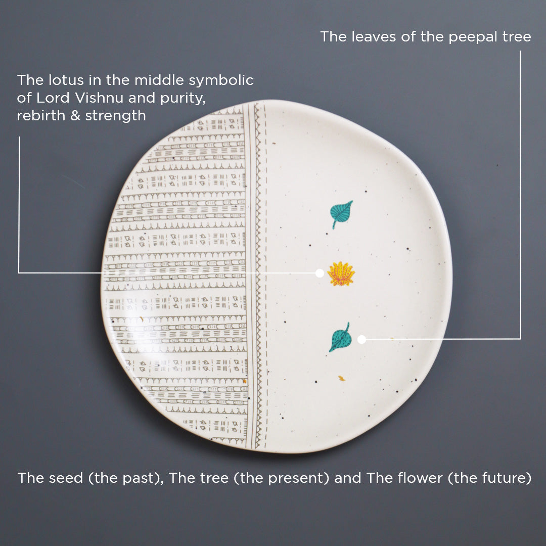 Peepal tree: Represents the house of Trimurti - Lord Brahma, Vishnu and Mahesh. While one half of the plate holds intricate patterns of peepal leaves, the other side highlights the lotus, symbolic of Lord Vishnu, & purity, rebirth and strength.