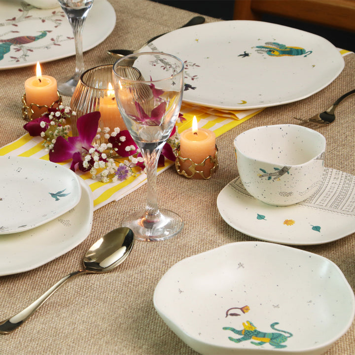 The अनादि Gond dinnerware collection is part of the Past.Present.Future series. The essence of Gond art derives from the intimate connection that the people of the Gond tribe share with nature and therefore, each piece in this collection features Nature as the Eternal Witness.