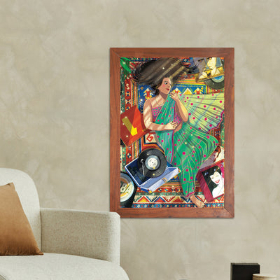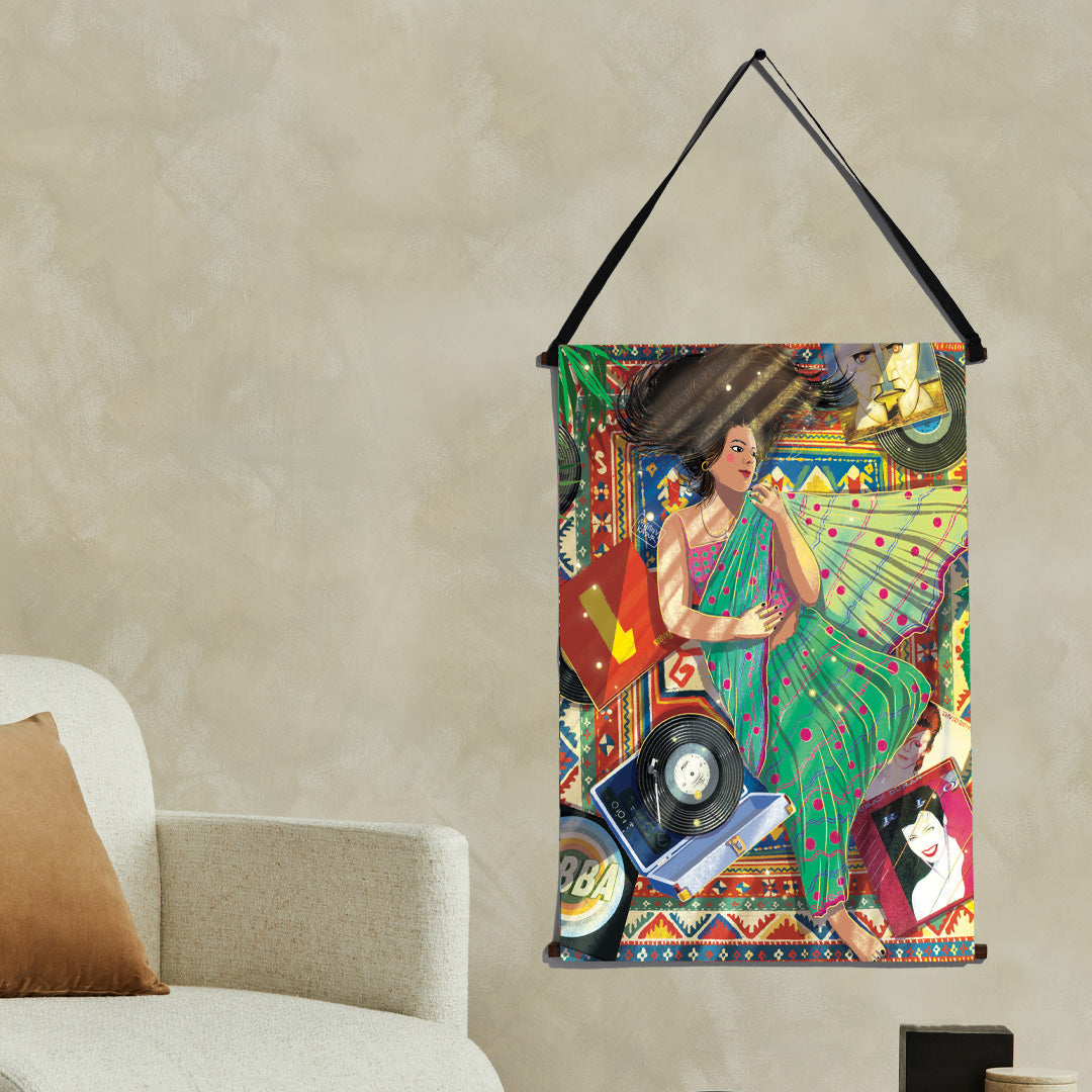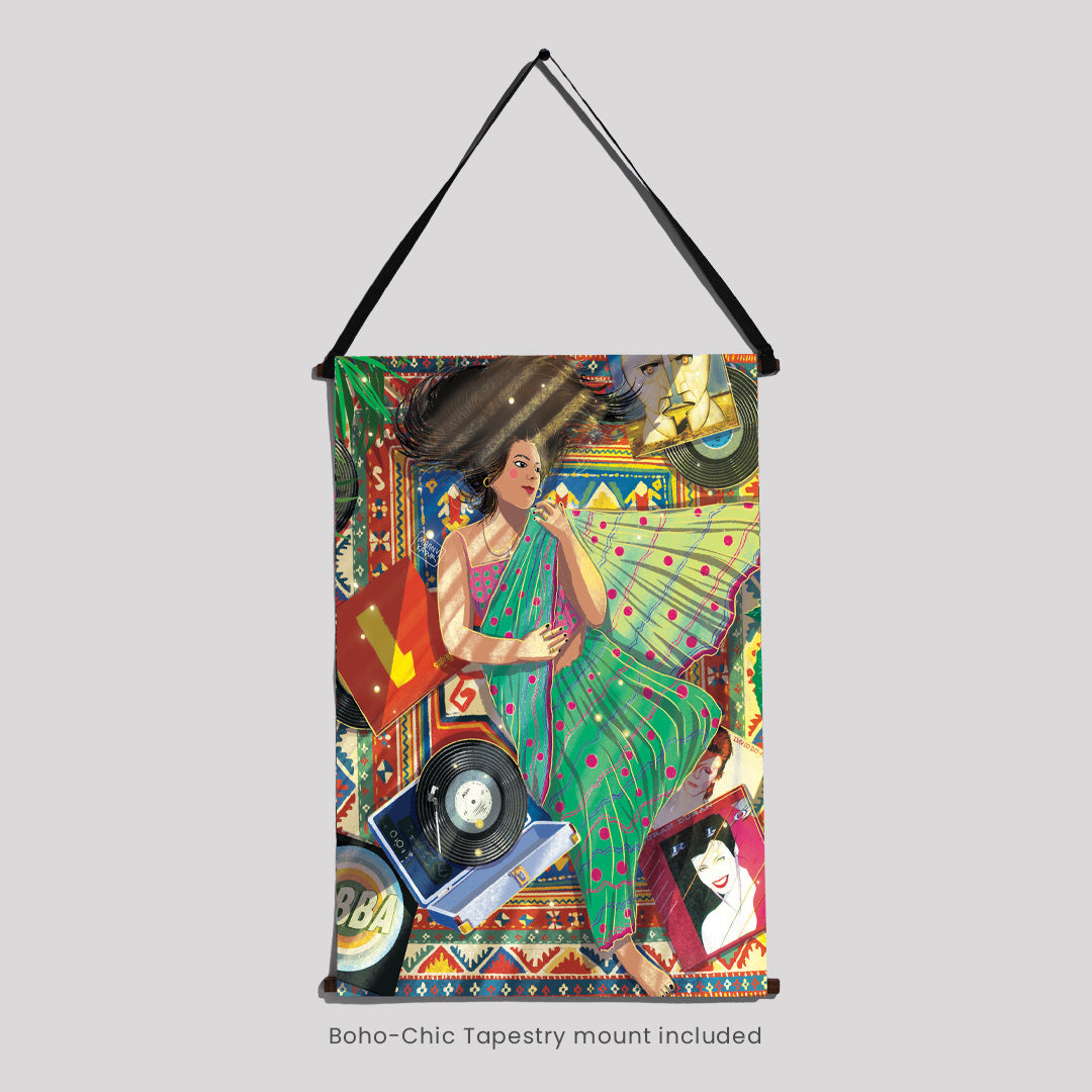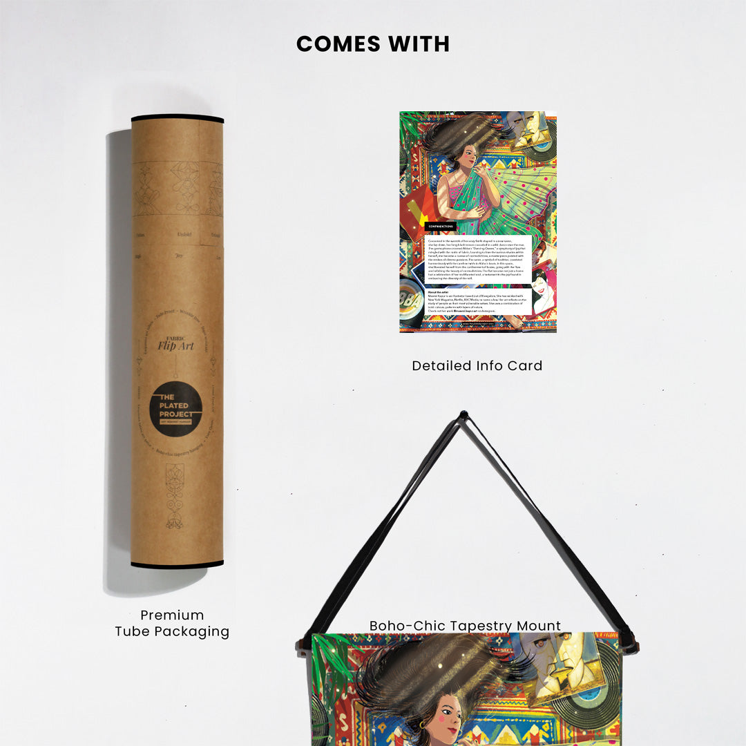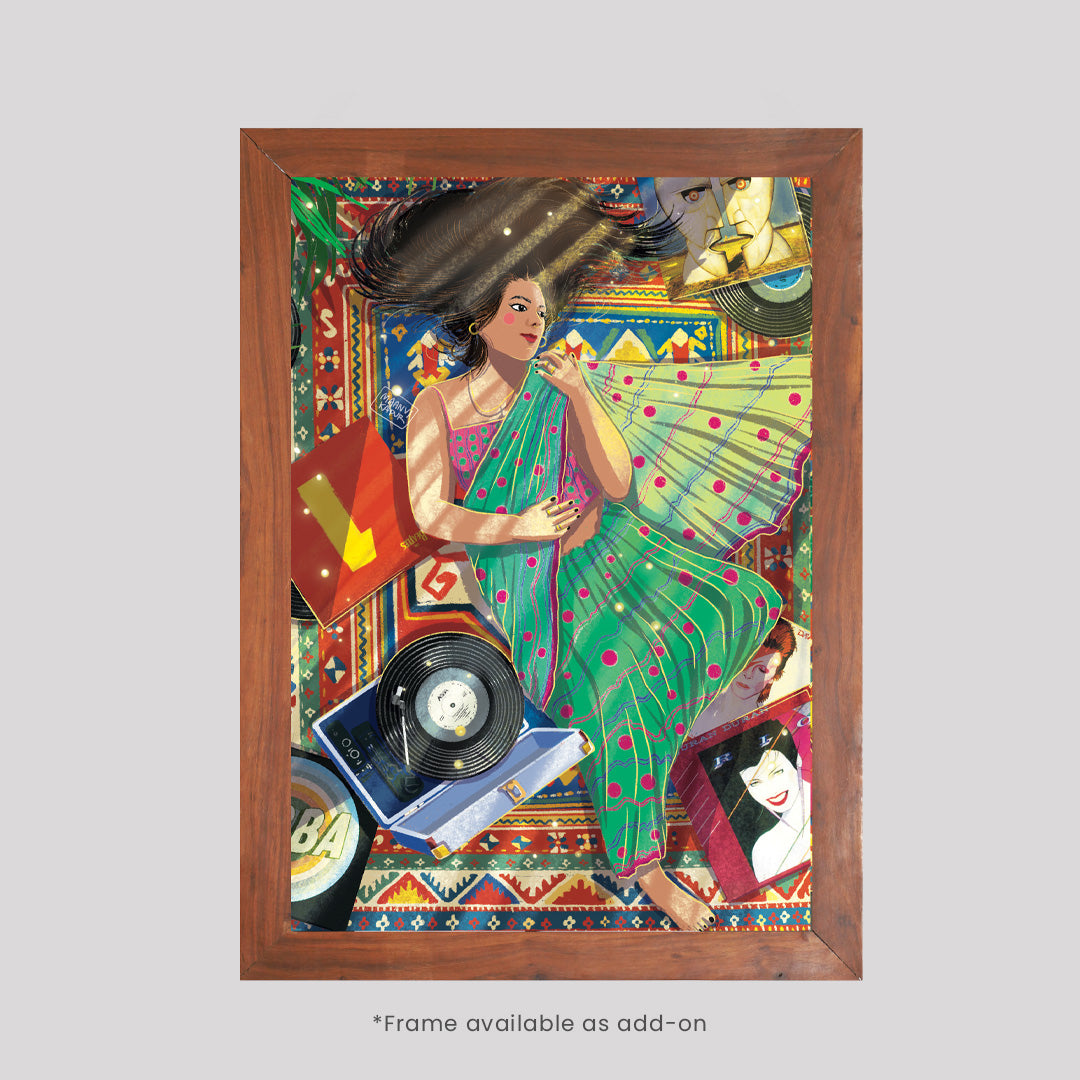 Cocooned in her cozy flat & draped in a new saree, she lay down, her long black tresses cascaded in a wild dance over the mat. The gramophone crooned Abba's ""Dancing Queen,"" a symphony of joy that mingled with the rustle of fabric. Learning to love the various shades within herself, she became a canvas of contradictions, a masterpiece painted with the strokes of diverse passions. The saree, a symbol of tradition, coexisted harmoniously with the carefree twirls to Abba's beats. In this space, she liberated herself from the confinement of boxes, going with the flow and relishing the beauty of contradictions. The flat became not just a home but a celebration of her multifaceted soul, a testament to the joy found in embracing the diversity of the self.