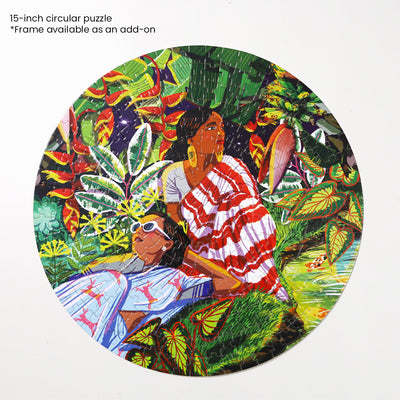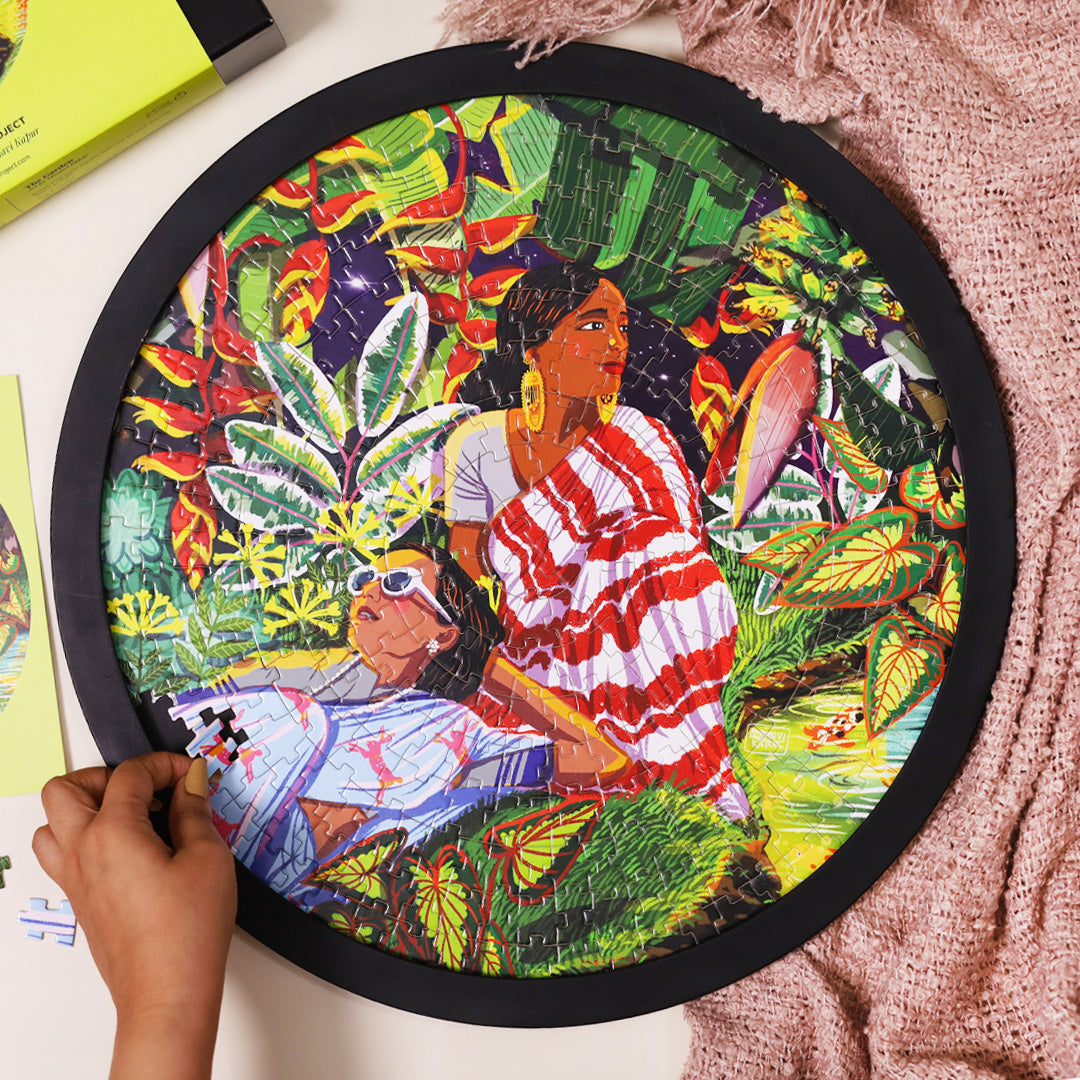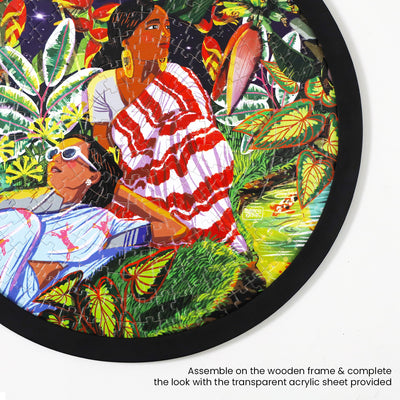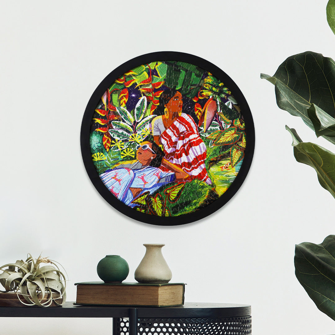 Circular Puzzle with artwork of two women in the garden against a white wall | home decorative items